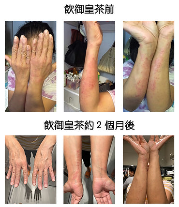 1 teabag of The Imperial Tea a day, and after 1 month, the spots on the face are obvious gone; the sleep has been significantly improved, and can sleep straight till next morning; the menstrual flow has returned to normal; the watery stool after the gallbladder operation is back to normal; the shoulder pain disappears.